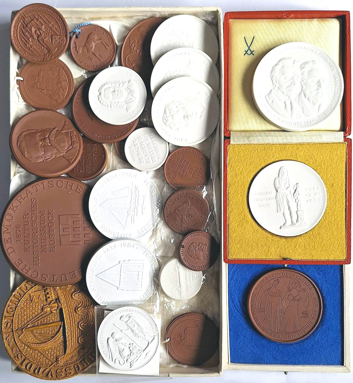 27 verschiedene Medaillen Meißner Porzellan und Böttgersteinzeug, vielfältig, dabei auch vieles aus Rostock, Stralsund u.a. Orten Mecklenburgs, teils Originalverpackungen vz-prf
