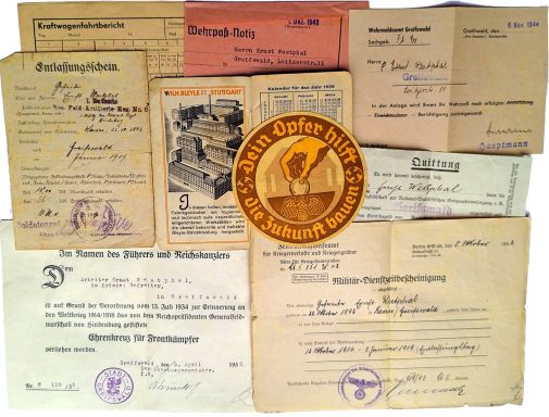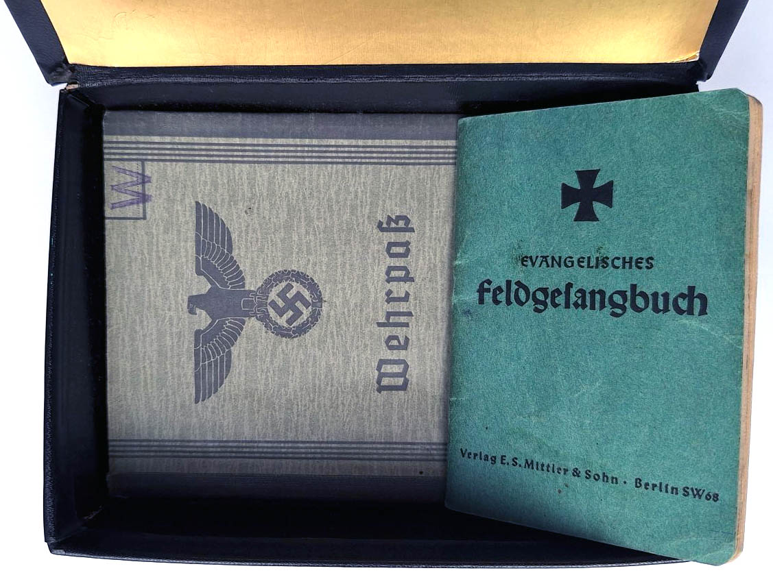 Schatulle mit Nachlass aus zwei Weltkriegen: Militärpapiere, Feldgesang-buch, Auszeichnungen, Abzeichen und Medaillen. Zusammen über 20 Teile siehe Abbildungen
