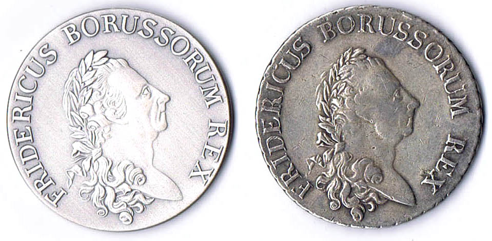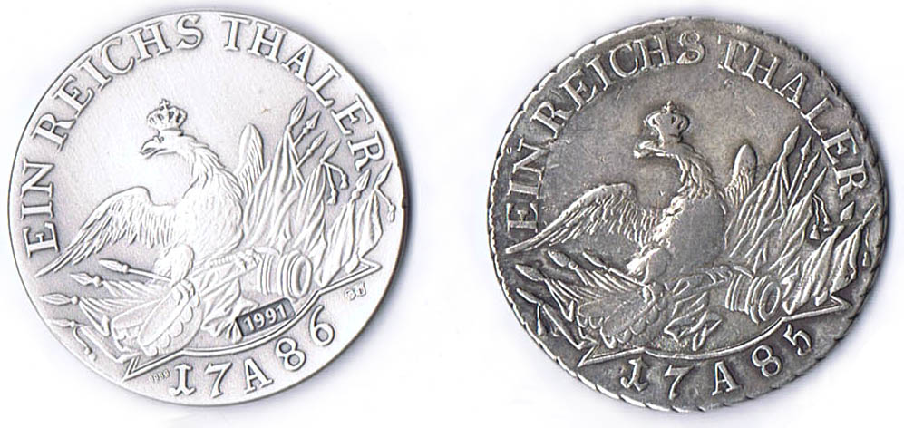 Dav. 2590, Olding 70, Schön 151, Kluge 123.5 Var. 21,85g fss dazu Nachprägung des Reichstalers 1786 durch die Berliner Münze 1991 in Ag 9999 21,88g prf 2 Stück