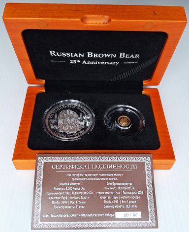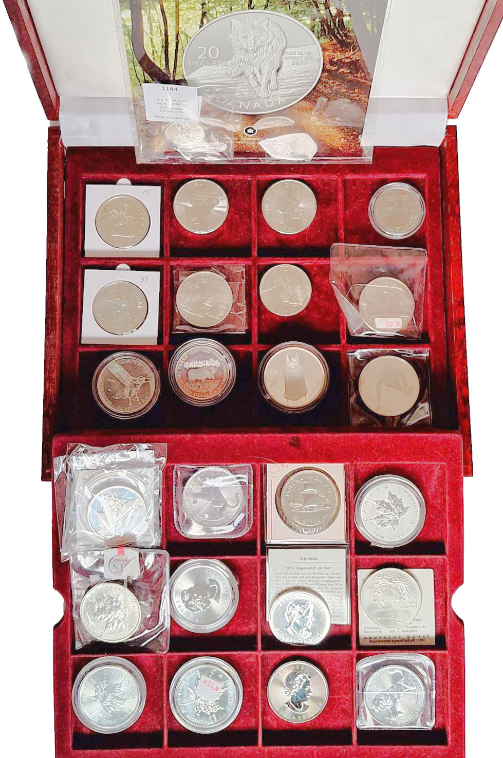 Große Samtkassette „Endangered Wildlife“ darin 30 Münzen mit Tiermotiven, meist Silbermünzen aus vielen Ländern weltweit bis 50 Dollar Cook-Inseln und 5 Yuan Panda 1994, 6 Stück mit Schatulle sonst zumeist gekapselt oder in Originalfolie vz-PP