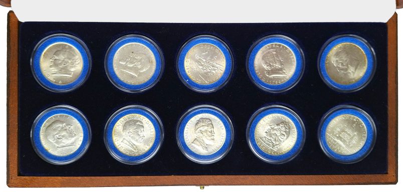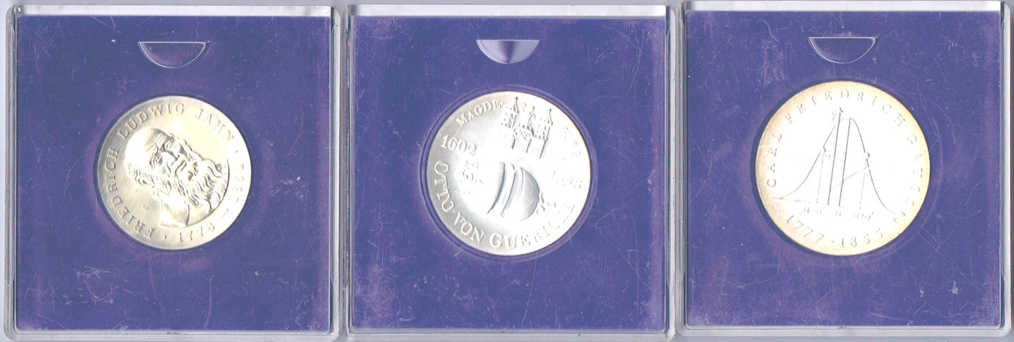 12 verschiedene Porzellanmedaillen KPM Berlin, zumeist mit Bestimmung nach Beyer und teilweise in Originalverpackung. Dabei Robert Koch, Schiller 1955, Schinkel, Wilhelm v. Humboldt 1967, Willi Brandt 1971, Mommsen 1974, Heinrich und Thomas Mann 1975, v. Weizsäcker 1984 u.a. vz-prf