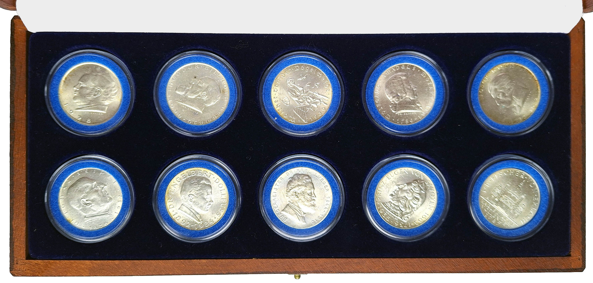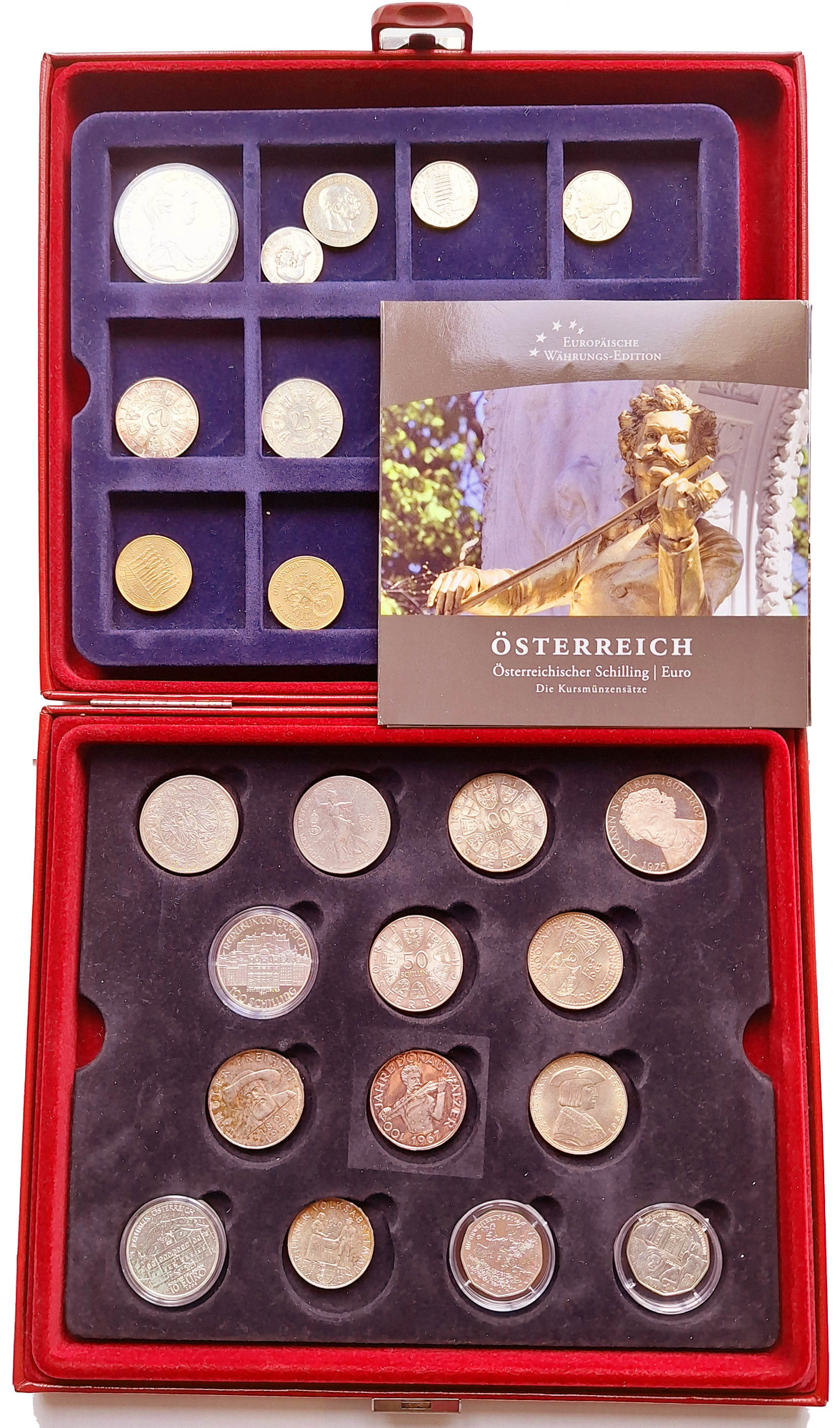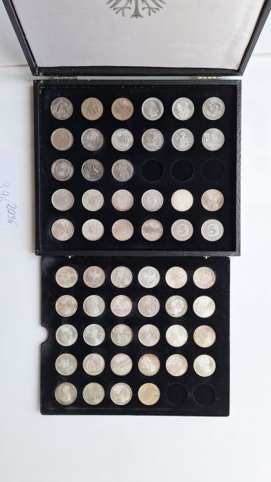 Kassette mit 23 deutschen Münzen in quadratischen Münzkapseln, dabei 2x ½ Mark, 4 Pfennig 1932 D, 7x Danzig bis 1 Gulden 1932, 10x 3. Reich mit 5 Silbermünzen, 10 und 20 Franken Saarland 1954 meist ss