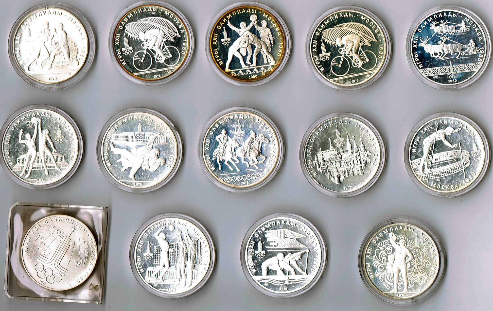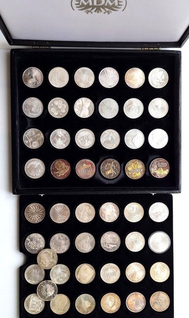 Große Samtkassette „Olympische Spiele“, darin 23 Olympia- und Sportmotivmünzen, Medaillen und eine Plakette. Dabei 12x 10 Euro Griechenland zu den Spielen 2004 in Athen, China 10 Yuan 2008, 10 Euro Spanien u.a.m. Alle gekapselt und in bester Erhaltung prf-PP