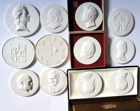 14 verschiedene Porzellanmedaillen Meißen, 6x braun, 8x weiß. Dabei 3er Set Fürstenwalde in originaler Box mit Leinenbespannung und Golddruck Ø je 65mm, Vs. Wappen / Rathaus / Spreebrücke vor Industrie, rückseitig Geschichtsdaten Schwertermarke. Weitere mit Originalverpackung: Berlin Weltfestspiele 1973, VEB Werk für Signal- und Sicherungstechnik, Staatliche Museen Alexander von Humboldt MDCCCXXXXVII, VEB Vereinigte Wettspielbetriebe „Für besondere Verdienste“, Deutscher Städte- und Gemeindetag, VEB Kombinat Elektroprojekt und Anlagenbau. Weitere: 15 Jahre Radio Berlin International, VEB IHB, KADEWE 1996 J.G. HÖROLDT, Barockgarten Gross-Sedlitz, Neuruppin Th. Fontane vz-prf