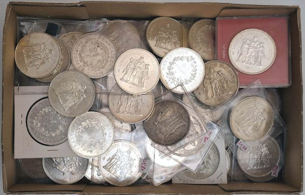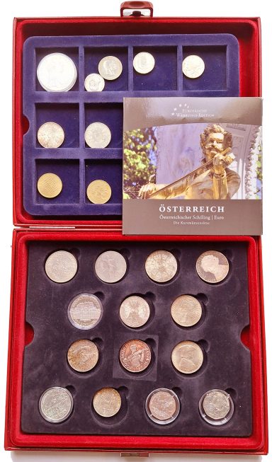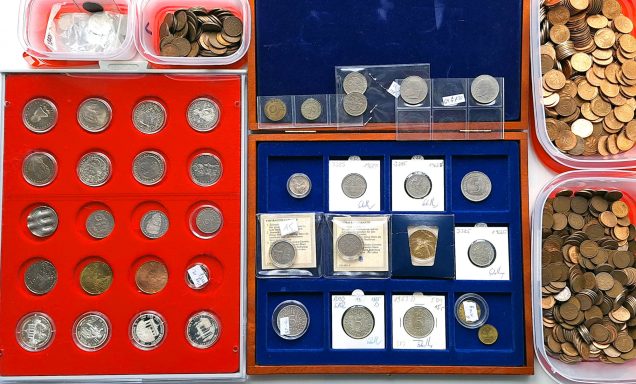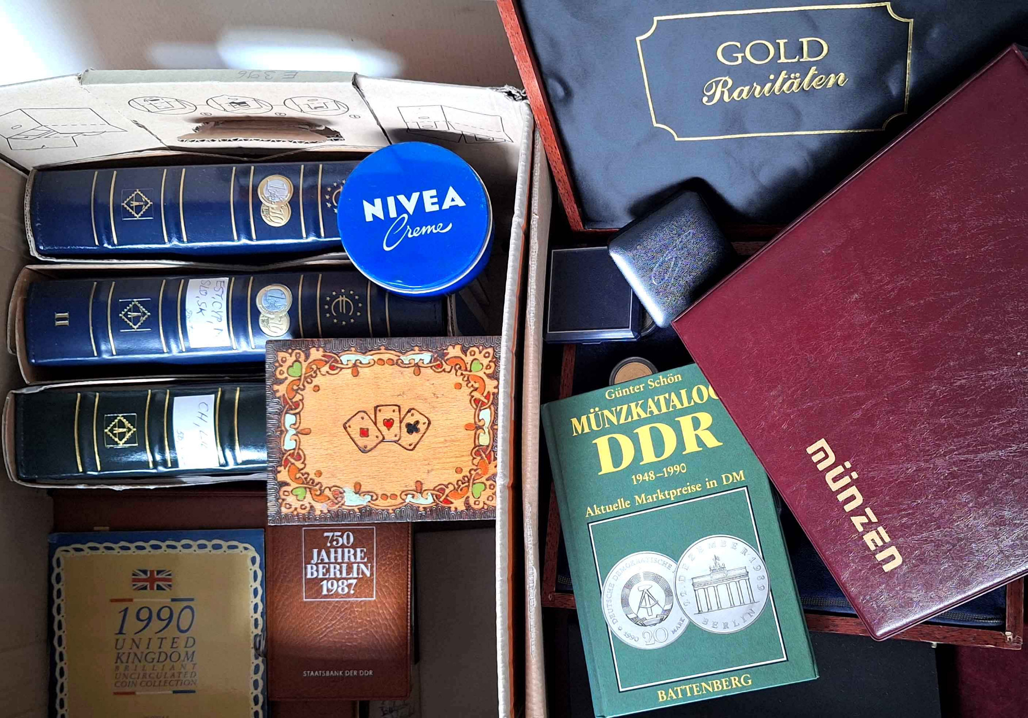 Umfangreicher Posten Münzen und Medaillen aus aller Welt. Umzugskarton mit 7 teils hochwertigen Alben, einer Holzkassette darin Zweieurostücke mit z.B. 2x Finnland 2004 „neue Euroländer“, Münzmappe DDR Berlin 1987, 3 Stasi-medaillen in Originalkassette, Kassette Vatikan-“Specimen“ mit Silberstück, kunsthandwerkliche Holzschachtel für Kartenspiele mit Kleinmünzen DR ca.1875-1945, Blechdose DDR-Klein-münzen. In den Alben Münzen aus: Bulgarien, Dänemark, Frankreich, Großbritannien (Originalsatz 1990 Royal Mint), Italien, Kanada, Norwegen, Polen, Portugal mit 5 und 10 Euro Silber 2003, Russland/SU, Schweden, Schweiz (37 Stück ab ½ Franken 1945, zus. über 30 Franken). Somalia 2000 Sh. 2003 Benedikt, Spanien (mit 12 Euro 2003 Silber) u.a.m. bis Zypern, dazu ein zweiter Karton mit Zubehör: Diverse ältere Kataloge, Holzkassetten, Alben, Etuis, Zertifikate u.a.m., zusammen über 25 kg, unterschiedliche meist gute Erhaltungen