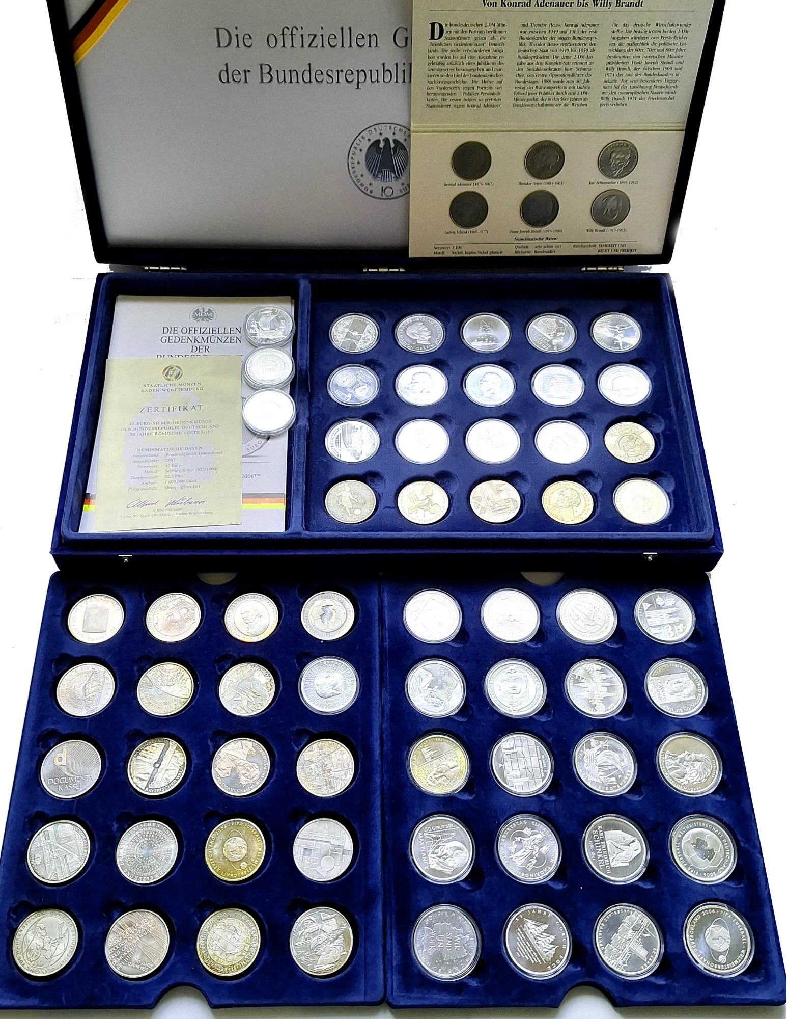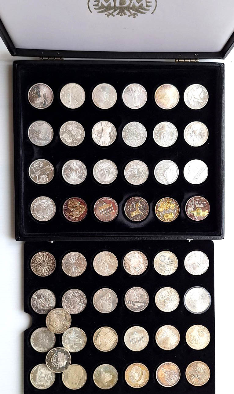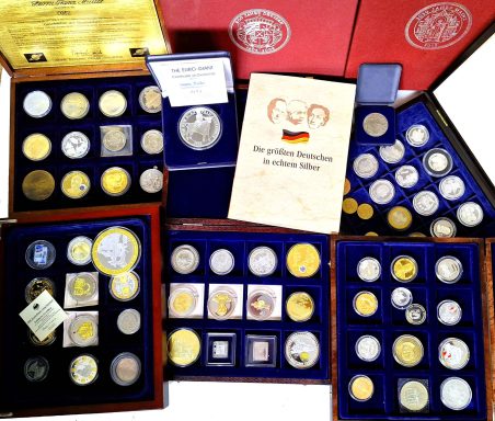 Konvolut moderne deutsche Münzen und Medaillen von DM bis Euro, auch einige DDR-Stücke. Medaillen oft unedel, versilbert und vergoldet, aber auch viele Silberstücke dabei. Motive u.a.: Präsidenten und Kanzler, Luther, Münzgeschichte, Fußball, Persönlichkeiten, München, ILA u.a. ss-PP