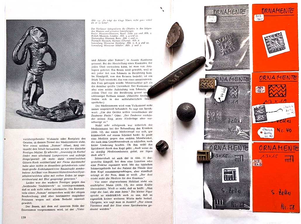 2 Aschanti-Goldgewichte aus Westafrika 13,6 und 9,5g, Chinesisches Seidengeld 46g, Bootsgeld mit Marke am Boden 39g, Kugelgeld mit 2 Gegenstempeln 15,2g, Eisenkugel (Borneo?) 54g, 6 Stück dazu Mappe mit Beschreibungen, Angeboten, Erläuterungen zum Thema ss