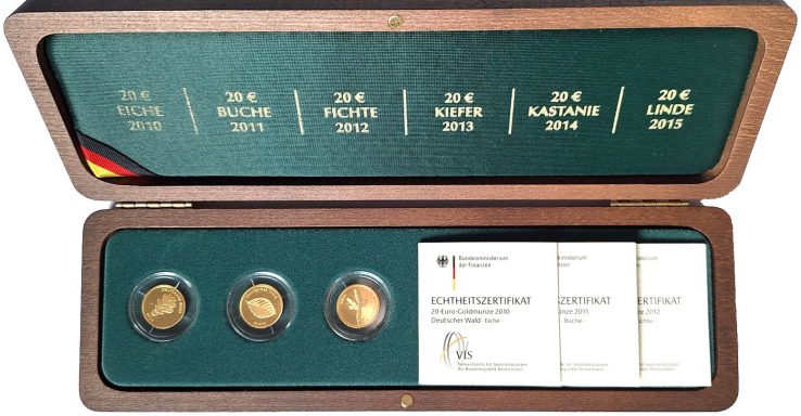 Karton Euromünzen, dabei 10 Euro 2012 Nationalbibliothek vergoldet in „Prestige Card“, 10 Euro 2007 Wilhelm Busch in PP, 2x 5 Euro 2020 Subtropische Zone, 17x 2 Euro u.a. s-prf