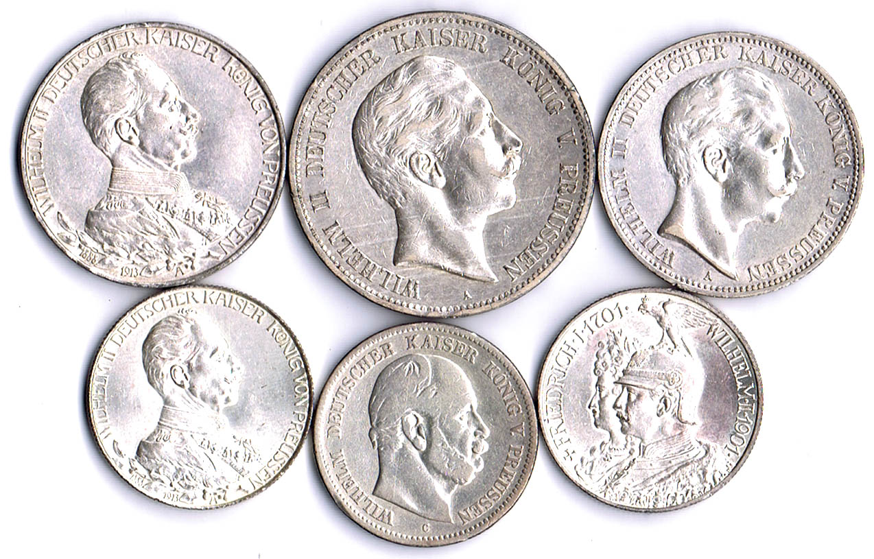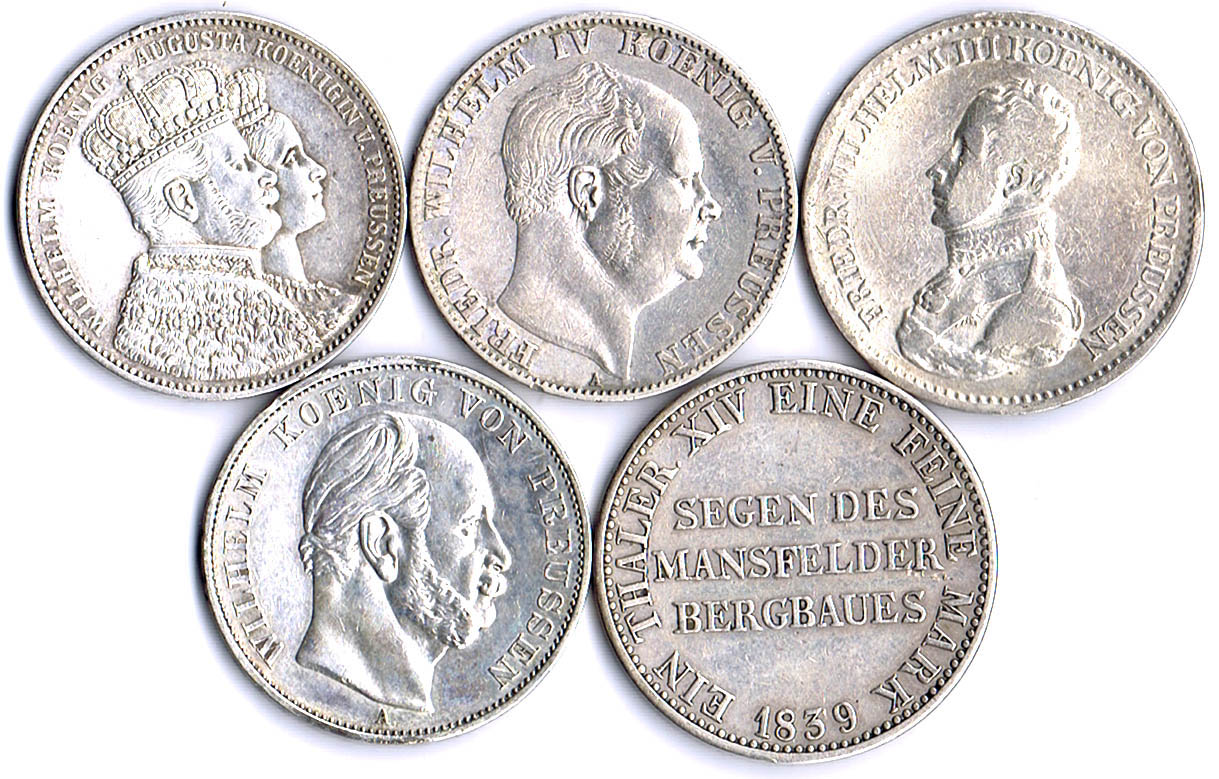 5 verschiedene Taler: 1818A, 1839A (Ausbeute Mansfeld mit Schrötlingsfehler), 1859A, Krönungstaler 1861, Siegestaler 1871 AKS 13, 18, 78, 116, 118 fss-ss