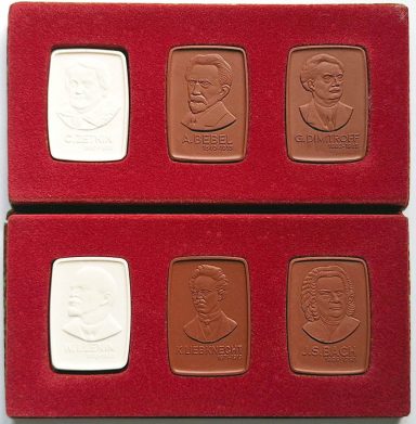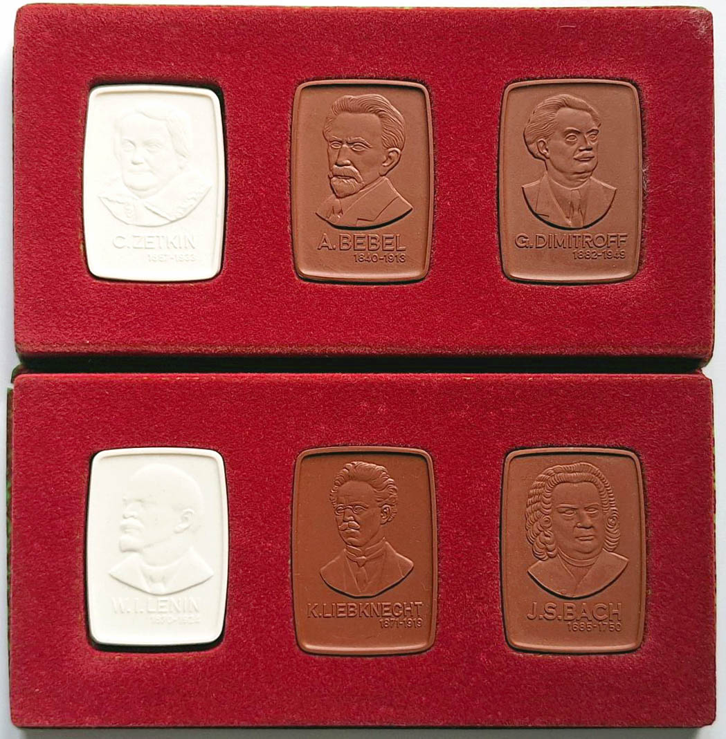 6 verschiedene Plaketten der Stadt Leipzig auf bekannte Persönlichkeiten mit Bezug zu Leipzig ohne Jahresangabe (1970), Vs. Porträt und Daten, Rs. Stadtwappen, Unterschrift und Schwertermarke, 4x Böttgersteinzeug 60x42mm Auflage je 5000 Stück, 2x weißes Porzellan 57x41mm, Auflage je 560 Stück in zwei originalen Blistern (diese leicht beschädigt) prf