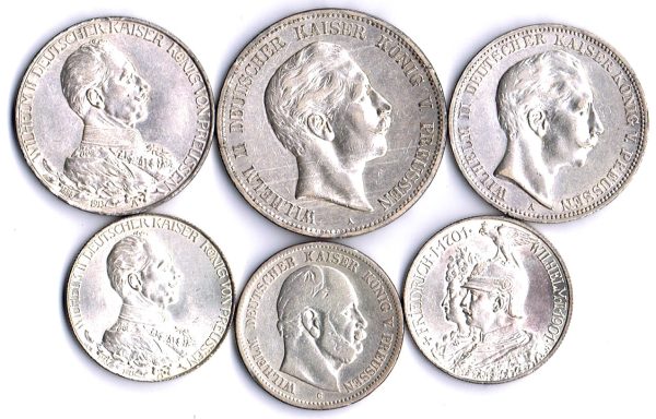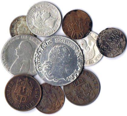 ½ Taler 1765A (Broschierungsspuren), 1/3 Taler 1801A, 1/6 Taler 1839A und 1844A, 1/24 Taler 1782 und 1783A. Silbergroschen 1854A, 3 Pfenninge 1867 und 1868A, 2 Pfenninge 1864A 10 Stück ge-ss