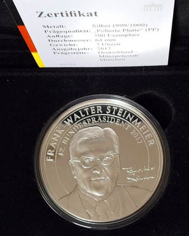 Steinmeier, Frank Walter: Nummerierte Silbermedaille 2017 zu 3 Unzen Feinsilber in großer Repräsentationsbox mit Schutzschuber und Zertifikat, geprägt in der Münze München, Auflage 500 Ex. PP