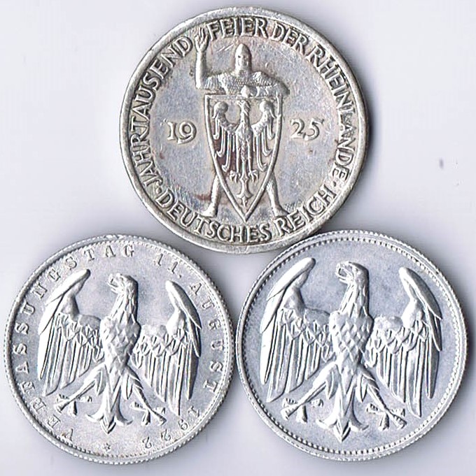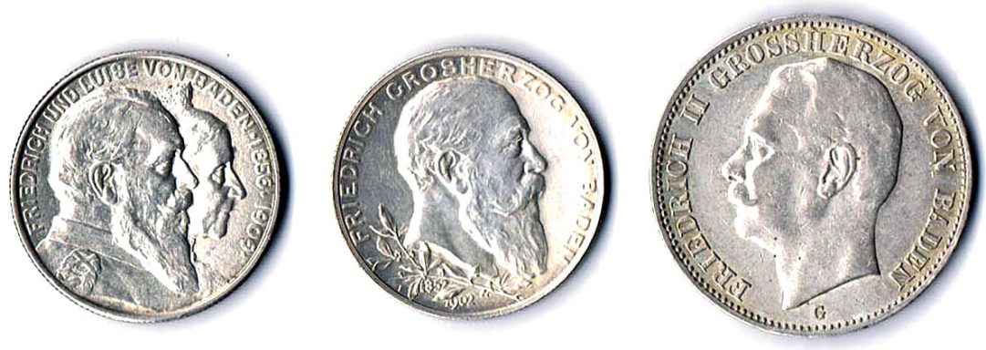 2 Mark 1902 Regierungsjubiläum, 2 Mark 1906 Goldene Hochzeit und 3 Mark 1908 3 Stück J. 30, 34, 39 vz und 2x fvz