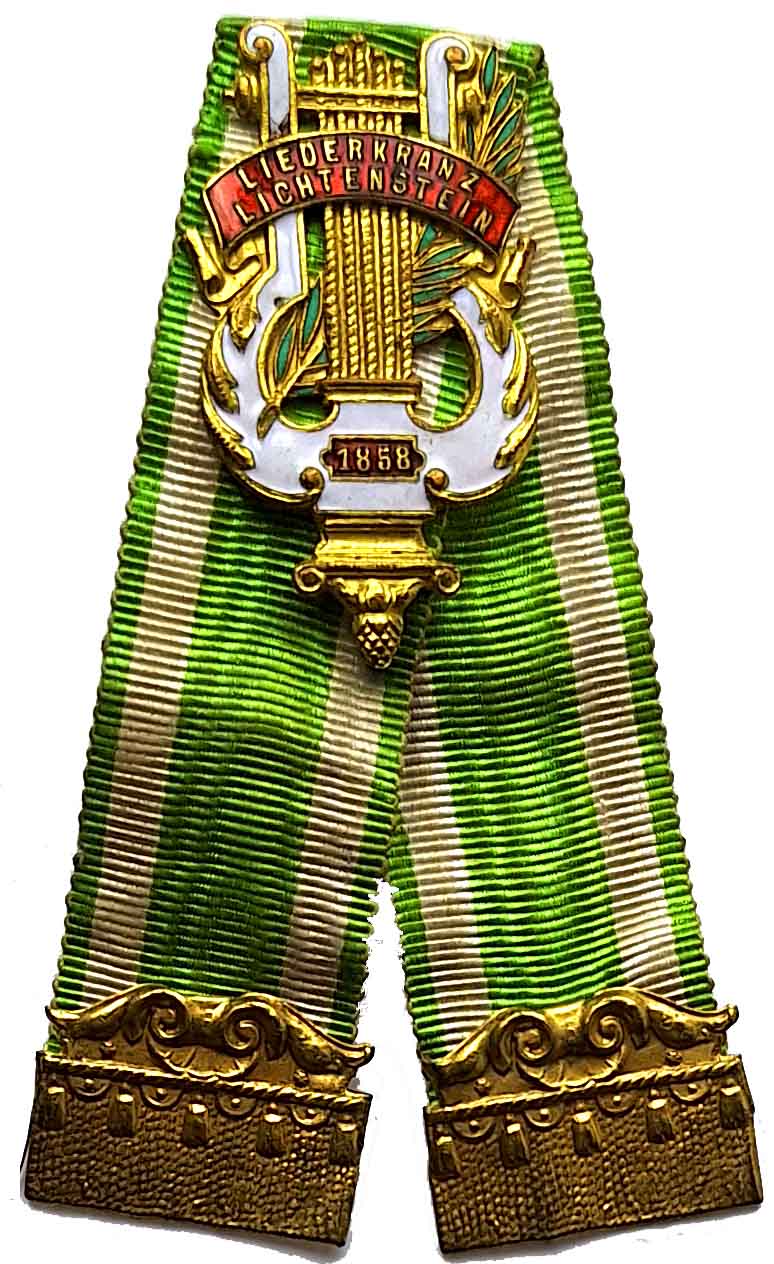 Abzeichen LIEDERKRANZ LICHTENSTEIN (in Sachsen), emaillierte Prägung von A. D. Schwerdt Stuttgart am grünweißen Band (ca. 75 mm) in guter Erhaltung fvz