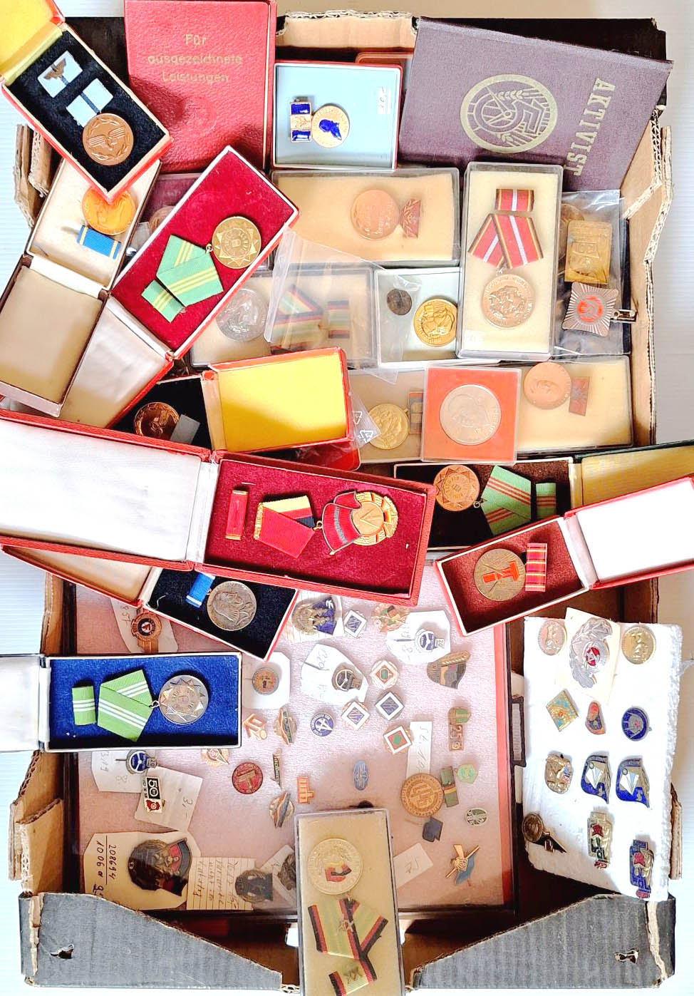 Konvolut Auszeichnungen DDR, viele Aktivisten und Treudienstmedaillen, dabei aber auch verschiedene interessante Medaillen und Abzeichen ab 50er Jahre z.B. ADMV Rallye Wismut 1971 im Originaletui und andere Zeichen, auch einige Urkunden u.a. Reichsbahnernachlass. Außerdem mehrere gebrauchte Spezialkataloge enthalten. Zusammen weit über 100 Stücke ss-prf