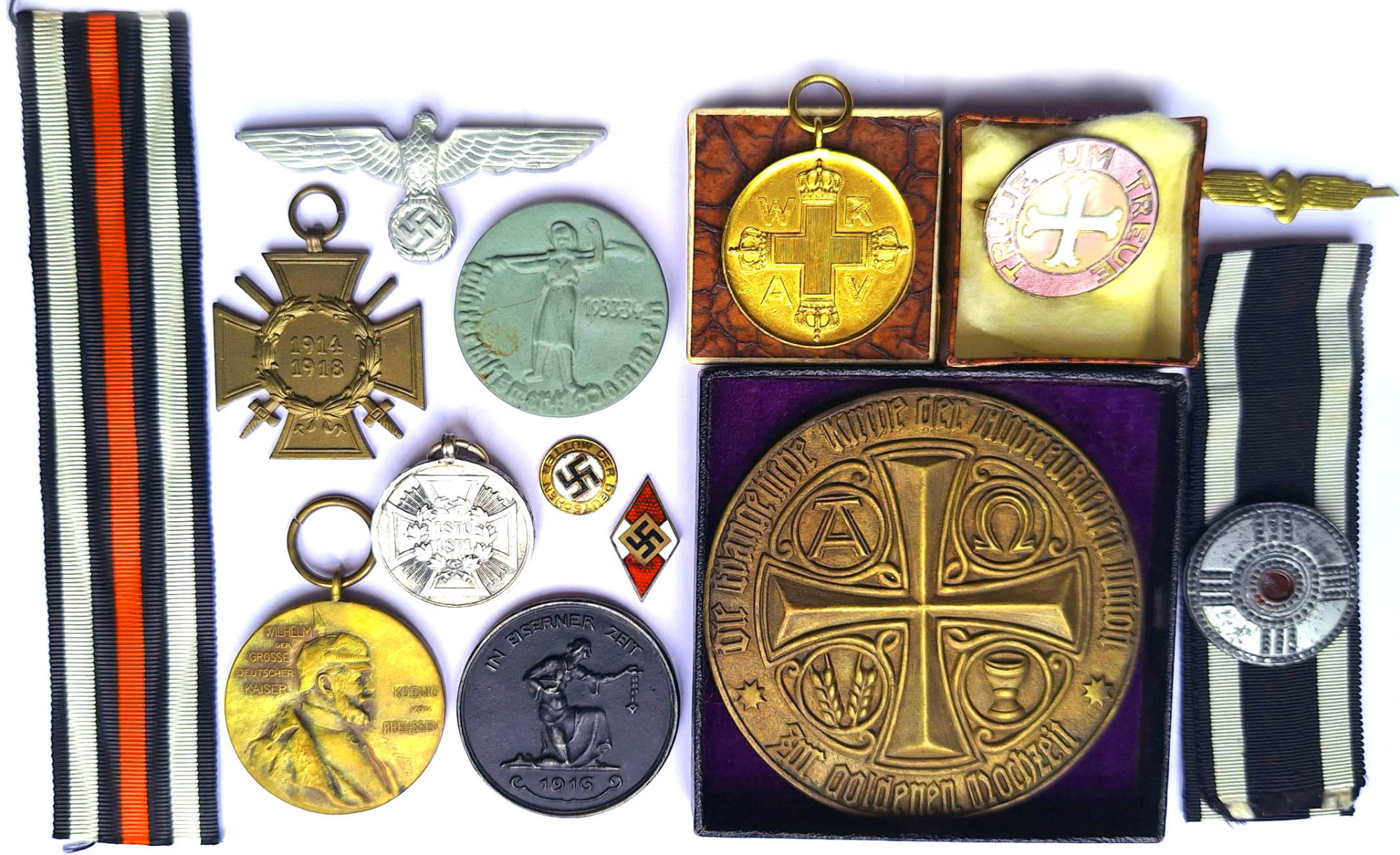 Deutschlandkonvolut: 12 Kleinmünzen Altdeutschland, Friedrich-August-Medaille in Bronze mit Band (Medaille vz, Band verschmutzt), Kleinmünzen von Kaiserreich bis 5 und 10 Pf. Alliierte, dabei 25 Pfennig 1912 F, Mark 1924 J, 10 000 Mark Westfalen vz, 7 Nachprä-gungen/Fälschungen von Talern und Reichsmünzen dabei 3 Mark Friedrich der Weise in guter Qualität, 12 Marken u.a. zusammen ca. 50 Stück in überwiegend guten Erhaltungen s-PP