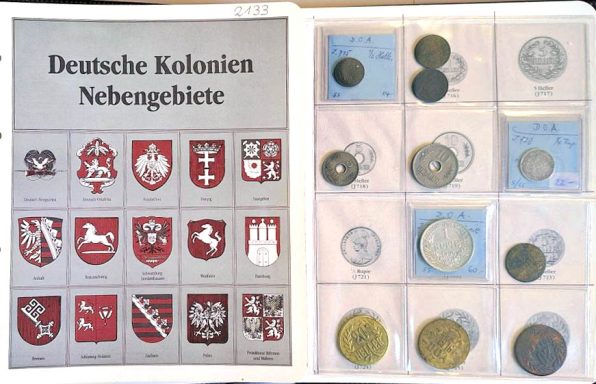 Älteres Münzalbum mit Kleinmünzen DR, wenig Altdeutschland und etwas Ausland. Darin auch 8x Silber: 2 Mark Preussen 1901 200 Jahre Königreich und 2 Mark 1900 Kursmünze (Rk.), 5 RM Hindenburg mit und ohne Kreuz, 4x 2 RM Hindenburg. Unterschiedliche überwiegend gute Erh., Silber angelaufen