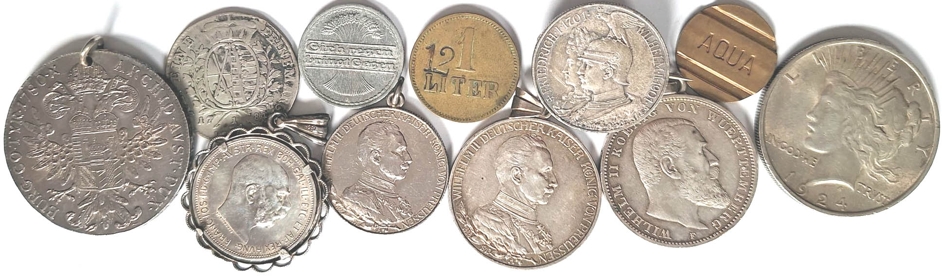 Posten mit 11 Münzen und Marken, darunter 6 als Schmuck verwendete Silbermünzen, 1/3 Taler Sachsen 1784 I.E.C. und Dollar 1924, Messingmarke Moos mit Zusatzpunze 12 (statt 1 Liter, so nicht bei Menzel) meist ss