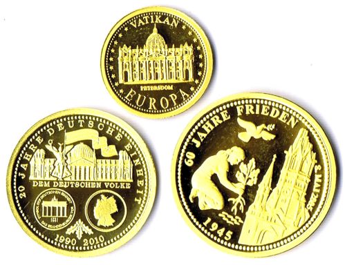 2 kleine Goldmedaillen der Firma Göde zum Thema Europa, dabei Kalendermedaille 2000, 0,5 und 0,8g GOLD 585 mit Zertifikaten PP