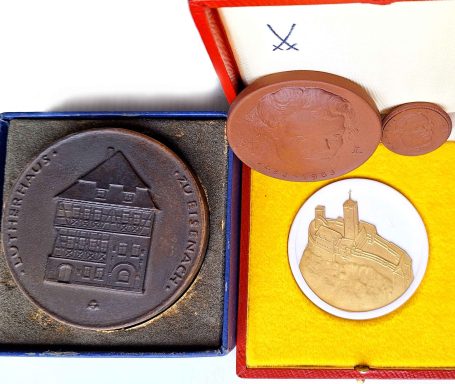 Martin Luther, 4 Stück: 1 Mark Eisenach 1921 braunes Böttgersteinzeug, Martin Luther 1983 Ø 40mm, einseitige Plakette Lutherhaus Eisenach Ø 40mm und Wartburg 1067-1967 weißes Porzellan Ø 73mm mit Goldapplikation in Originalschatulle vz-prf