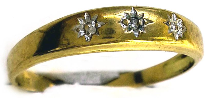 Schmuckring, Bandring vorn verbreitert mit 3 Sternen im mittleren ein kleiner Diamant, 1g Gelbgold 333, RM 58 (US 8,4) Tragespuren, Gebrauchserhaltung