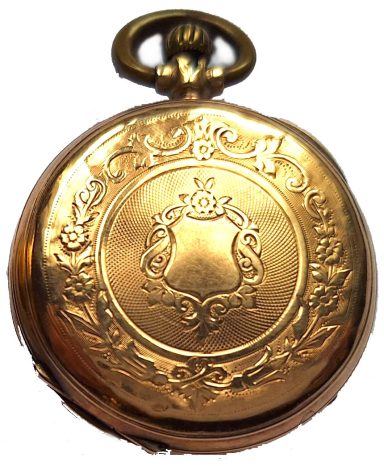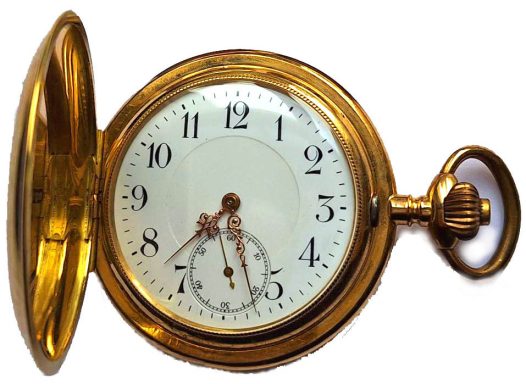 Kleine goldene Taschenuhr mit römischen Ziffern und Aufziehkrone, gestempelt K14 (Gold 585), Ø 31 mm Gesamtgewicht 27,1g. Die beiden Deckel öffnen fast 30° versetzt bei V Uhr, Hemmung gestört, deutliche Gebrauchsspuren am Rand, sonst gut erhalten