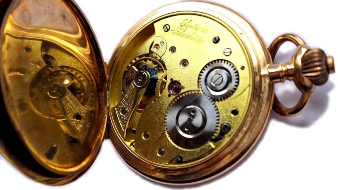 Goldene Savonette Taschenuhr System Glashütte mit drei Deckeln, etwa um 1910, beide Aussendeckel mehrfach gemarkt 585er Gold, funktionsfähig, Ø 54 mm Gesamtgewicht 103g, gute Gebrauchserhaltung