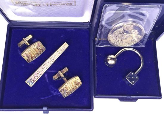 Design-Manschettenknöpfe und passende Krawattennadel aus Silber 835, Sonderanfertigung für die Firma Plasser & Theurer (Weltmarktführer bei Gleisbaumaschinen) stilisierte Gleiskörper, dazu ein weiteres Etui darin verbunden Kugel und Würfel aus Edelstahl sowie eine Feinsilbermedaille aus Anlass der 1. Mondlandung 1969