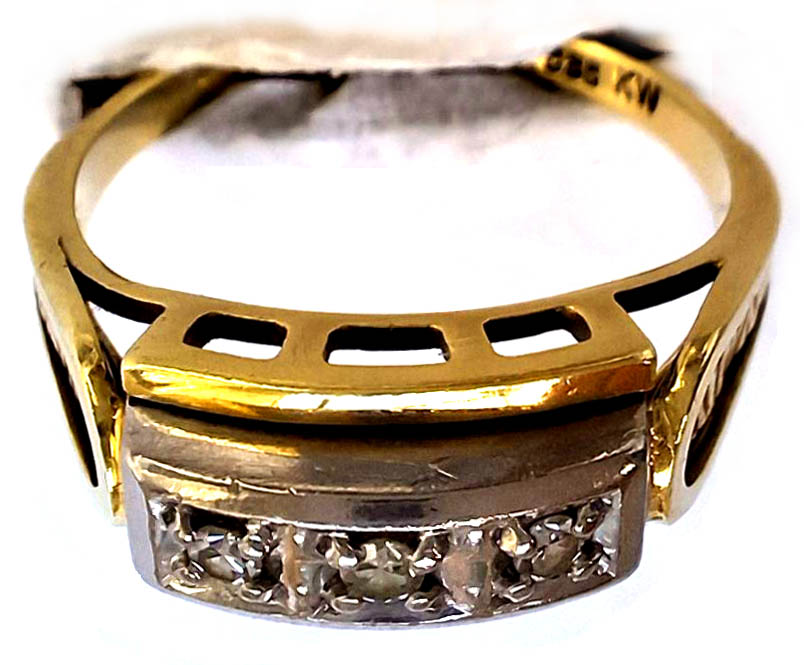 Schmuckring, Gelbgold 585 darauf Weißgoldfassung mit 3 kleinen Diamanten (je ca. 0,025ct.) in Reihe, 3,15g Gelbgold 585, RM 56 (US 7,6), Stempel 585 und KW, gute Gebrauchserhaltung