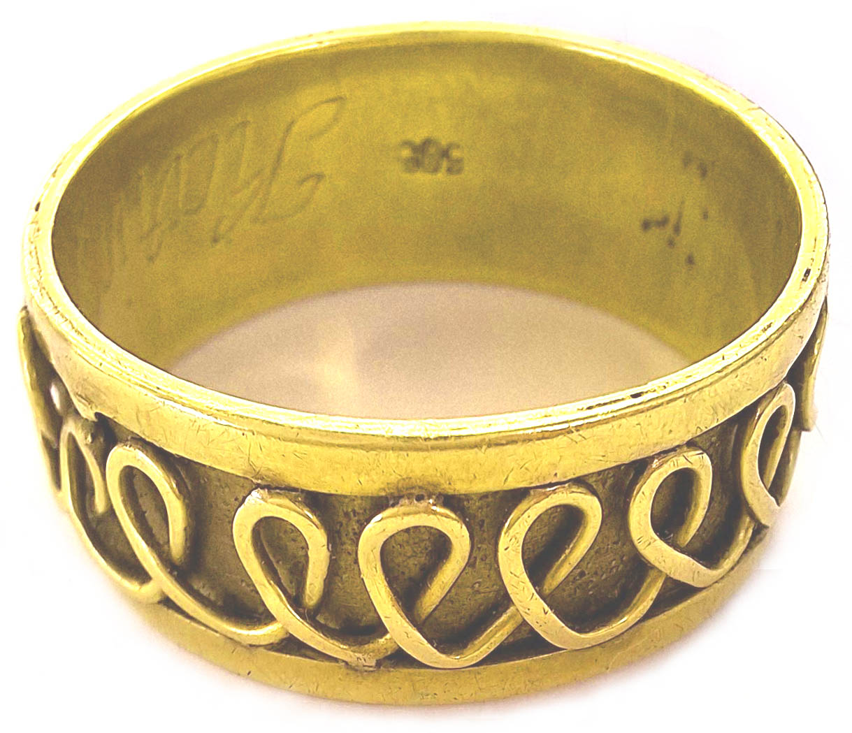 Breiter goldener Bandring mit Golddrahtauflage verschlungene Herzen, Handarbeit, Stempel 585 und Innengravur, 7,45g Gold 585, RM 55 (US 7,5) gute Gebrauchserhaltung