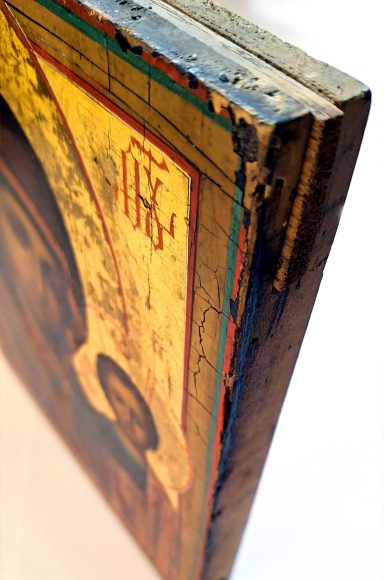 4 Ikonen wie abgebildet: 1) 26x31x2,4 cm mit zwei Sponki; 2) 24x34x2 cm; 3) 22x27x2,3 cm mit zwei oben und unten integrierten Sponki; 4) 21x28x1,6 cm. Provenienz: Nachlassteil einer in der DDR angelegten Privatsammlung