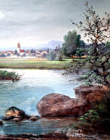 Flache Flusslandschaft mit alten Bäumen, frühherbstlich mit Dorf und Bergen im Hintergrund, signiert W.G. Scholz Breslau, Aquarell um 1920 auf Karton 99 x 69 cm unter Glas im großen schweren Holzrahmen mit schmaler Goldleiste (149 x 118 cm) gute Erhaltung mit nur kleinen Randmängeln und kleinen Rahmenschäden