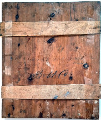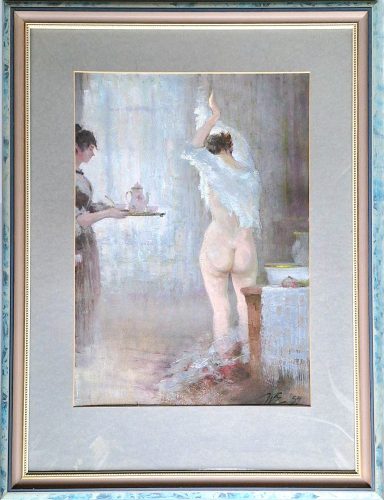 Gerahmtes Gemälde unter Glas 40 x 57 cm (Rahmen 63x83) signiert und datiert. Weiblicher Teilakt, Blick von hinten auf Entkleidung am Waschtisch in historischem Ambiente, sehr gute Erh.