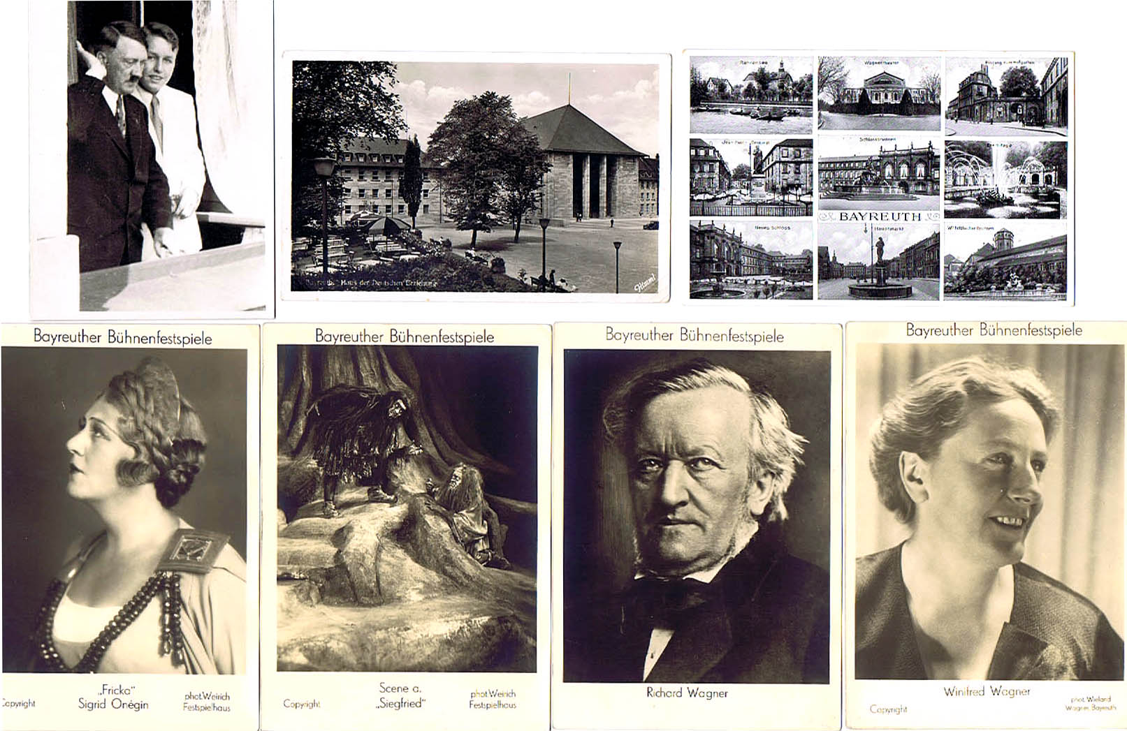 Bayreuth 7 Karten 30er Jahre, dabei Originalfoto Hitler und Wieland Wagner, 4 Festspielkarten, Haus der Deutschen Erziehung, 9-Feldkarte Stadtansichten WGB-KFR