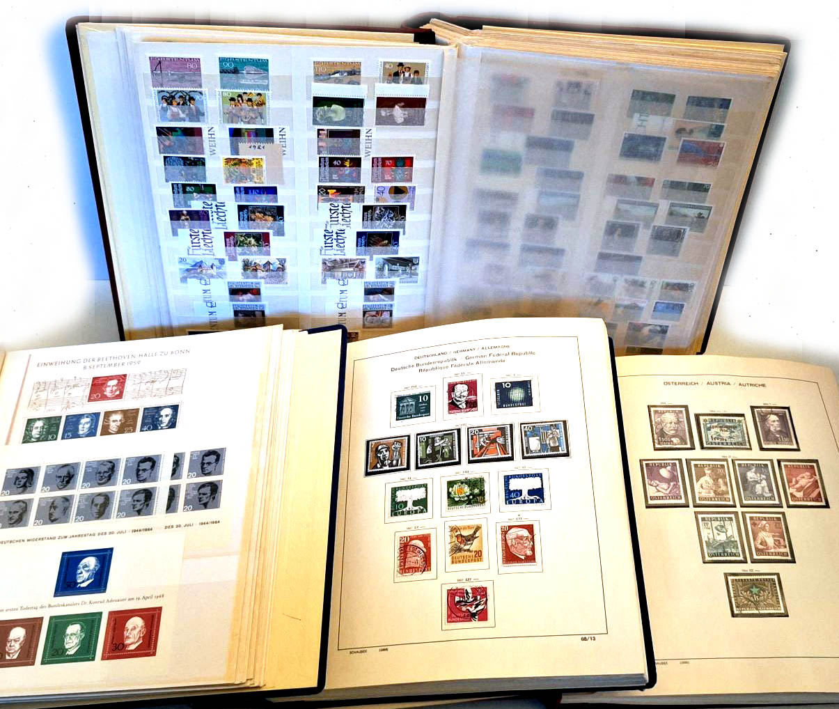 4 Schaubekalben mit Sammlungen BRD und WB, Österreich, Liechtenstein, Schweiz, Frankreich, Vatikan und einigen Motivausgaben Gemälde weltweit postfrisch und gestempelt. Dabei auch komplette Jahrgänge aus den 60er und 70er Jahren aber ohne frühe Ausgaben oder Besonderheiten, meist ordentliche Erhaltungen