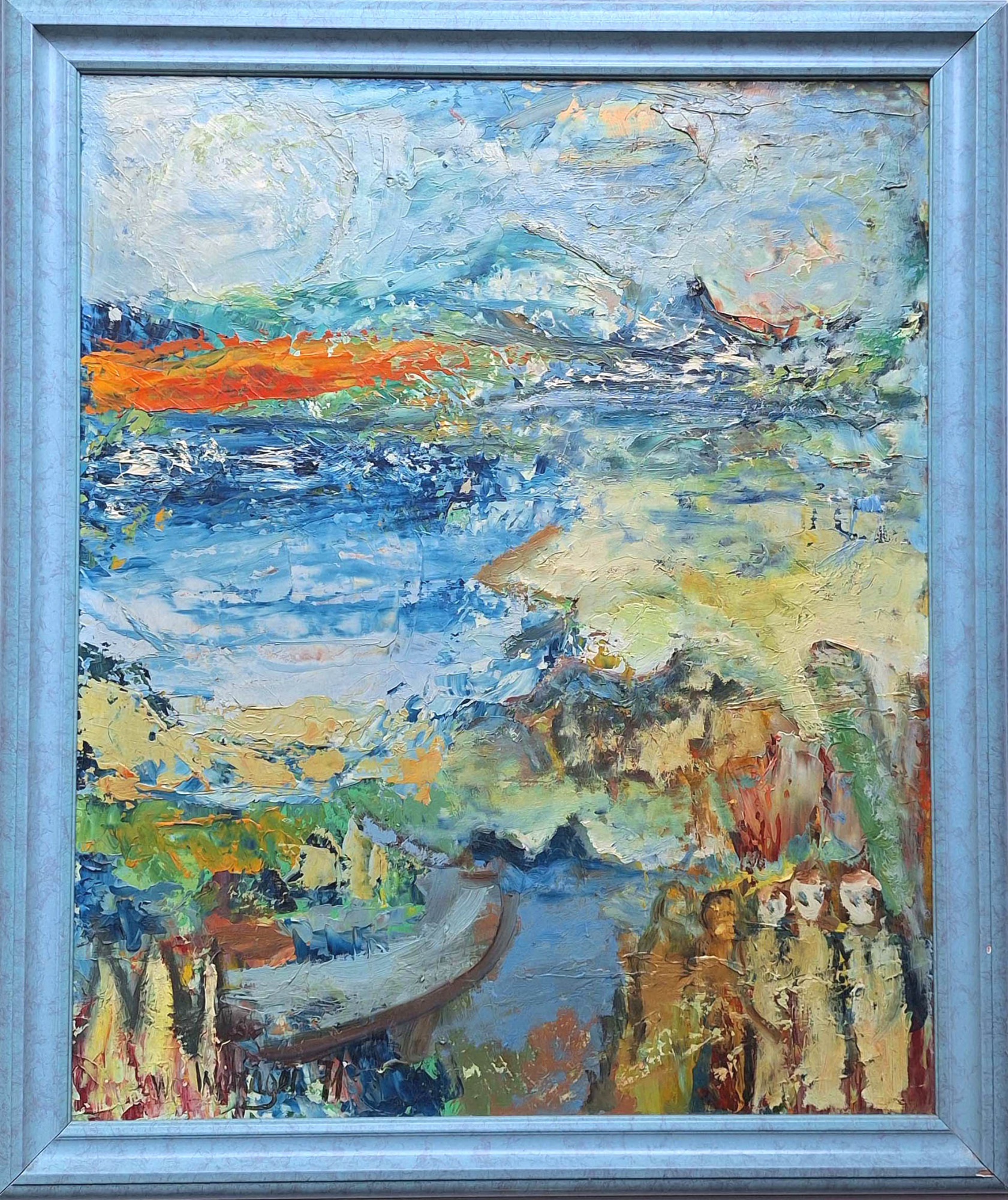 Ber (Bernhard) Warzager (1912-1988) Figurengruppe vor biblischer Landschaft, 1971, Öl auf Pressspanplatte 50x60,5 cm, mit Rahmen 63 x 83 cm, unten links signiert und datiert. Warzager wurde am 18.09.1912 in Tomaszów (Polen) geboren, studierte 1936-38 an der Akademie der Bildenden Künste in Warschau und war von 1939 - 1945 im Konzentrationslager Buchenwald. In den fünfziger Jahren wohnte er zeitweise in Israel, danach bis zu seinem Tode in Köln. Werke von ihm befinden sich u.a. im Rheinischen Landesmuseum in Köln. Sehr gute Erhaltung