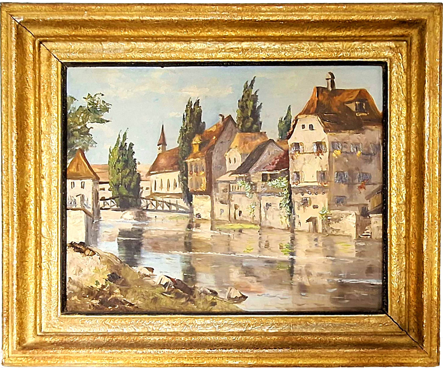 Stadtlandschaft, alte Häuser und Kirche am Fluss, Öl auf Pappe 50 x 39,5 cm, signiert K. Jäger im Rahmen 62 x 51 cm, Mitte 20. Jahrhundert, ordentliche Erhaltung mit geringen Mängeln