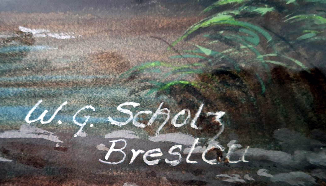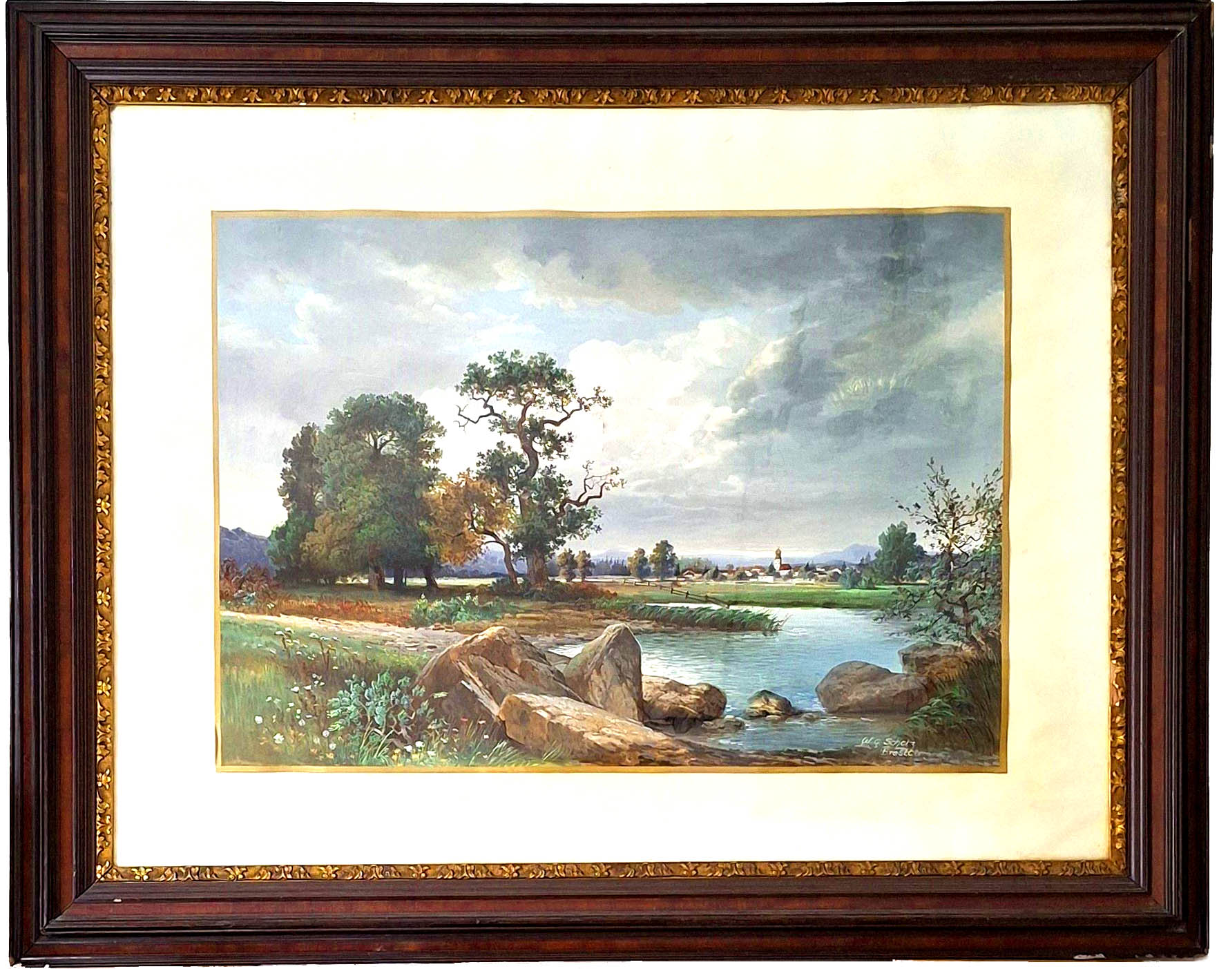 Flache Flusslandschaft mit alten Bäumen, frühherbstlich mit Dorf und Bergen im Hintergrund, signiert W.G. Scholz Breslau, Aquarell um 1920 auf Karton 99 x 69 cm unter Glas im großen schweren Holzrahmen mit schmaler Goldleiste (149 x 118 cm) gute Erhaltung mit nur kleinen Randmängeln und kleinen Rahmenschäden