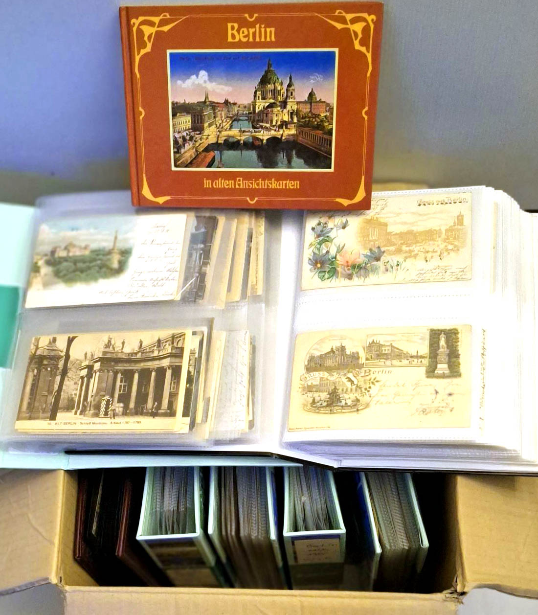 Berlin 7 Postkartenalben mit fast 700 Karten um 1900 bis ca. 1980, viele alte Karten aus dem Berlin der Kaiserzeit, dazu 5 großformatige Fotografien und Buch „Berlin in alten Ansichtskarten“ Gondrom Verlag 1994, zumeist gute und sehr gute Erhaltung GEB-NEU