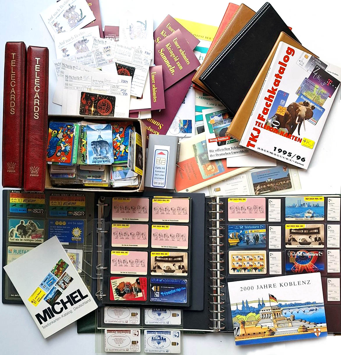 Großer Karton Telefonkartennachlass, 7 Alben und Mappen dazu Telefonkartenkataloge und Zubehör. Gesammelt von etwa 1986 (ab P 1) bis ca. 1996 mit hohen Investitionen, da viele Karten für tausende DM ungenutzt ** sein dürften. Alben teilweise geleert, aber hunderte Karten beiliegend, dabei auch Folder und Anlasskarten, zudem viele schöne Motive. Überwiegend deutsche Karten, aber auch etwas Ausland. Fundgrube für Motivsammler und vielleicht auch für Spezialisten, weit überwiegend sehr gute Erhaltungen. Bruttogesamtgewicht ca. 11 kg
