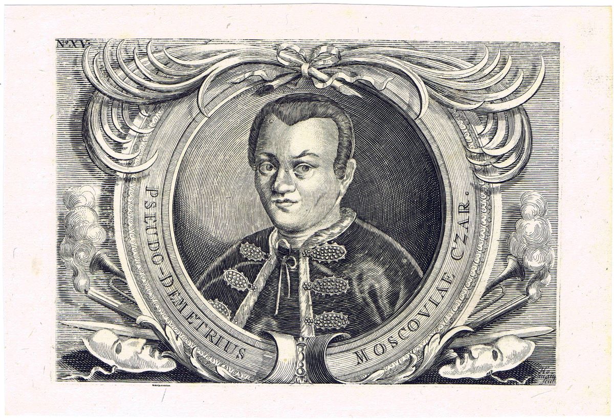 Kupferstich, Original um 1700 von Johann Lorenz Hönnig (1674-1713), Porträt des Zaren Dimitri I. (1605/1606). Der Mönch Juri Otrepjew ging als falscher Dimitri (Лжедмитрий I.) oder auch Demetrius in die Geschichte ein. Er gewann unter den Bojaren aber auch im Volk eine starke Anhängerschaft und ließ sich am 16.Juli 1605 zum Zaren krönen. Das Blatt trägt um das Porträt die Bezeichnung PSEUDO-DEMETRIUS MOSCOVIAE CZAR. sowie unten zwei Theatermasken, Waffen und Posaunen, eine deutliche Anspielung auf die Rechtmäßigkeit seines Thronanspruchs. Maße der Platte 175x120mm, des Papiers 210x142mm. Ein gleiches aber offensichtlich beschnittenes Exem- plar befindet sich in der Handschriftenabteilung der Staatsbibliothek zu Berlin - Preußischer Kulturbesitz. Sehr gute, frische Erhaltung mit nur einem kleinen Fleck im linken Rand, sehr seltenes Angebot